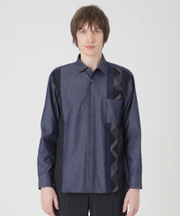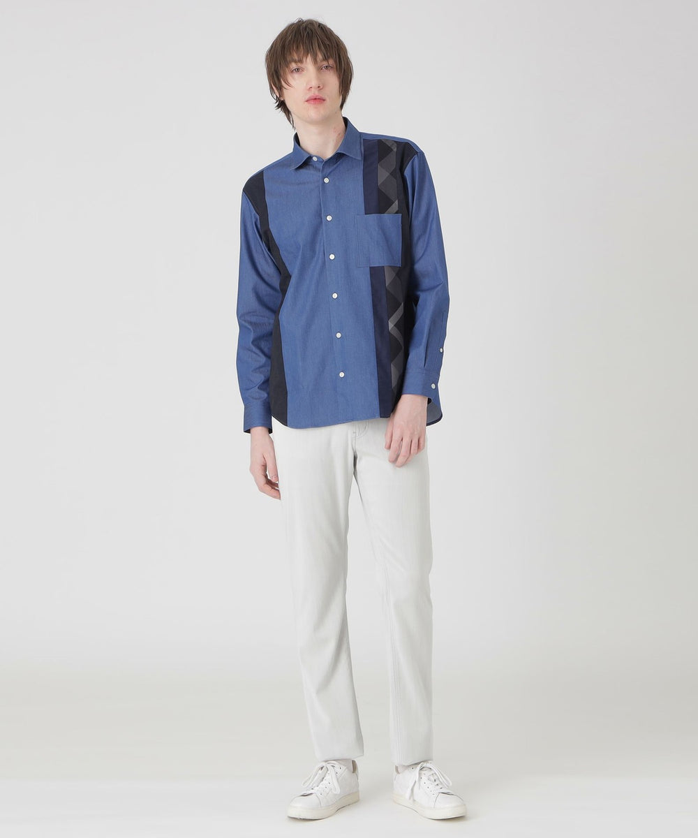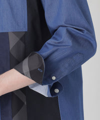【フロントをチェック柄で切り替えたパッチワークデザインのデニム調シャツ】