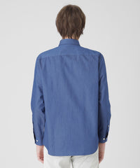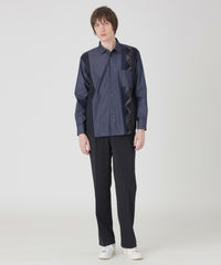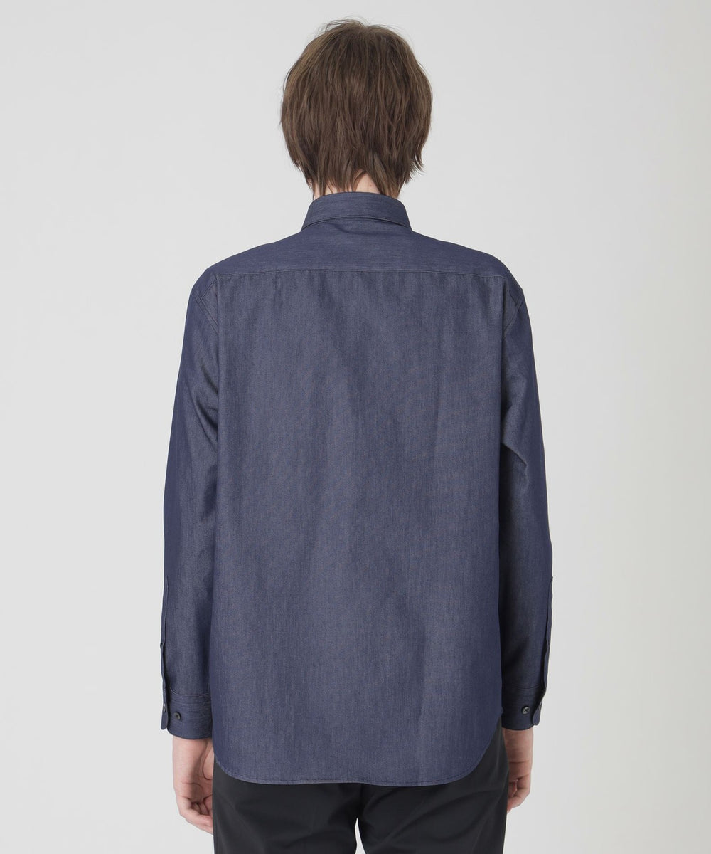 素材にはデニム調の生地を使用。タテ糸とヨコ糸を濃淡で染め分ける事で、デニムのようなシャンブレー感を表現しています。上品な光沢ある表面感と、適度なハリとしなやかさを合わせ持つ風合いが特徴です。