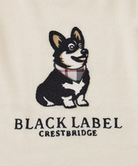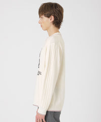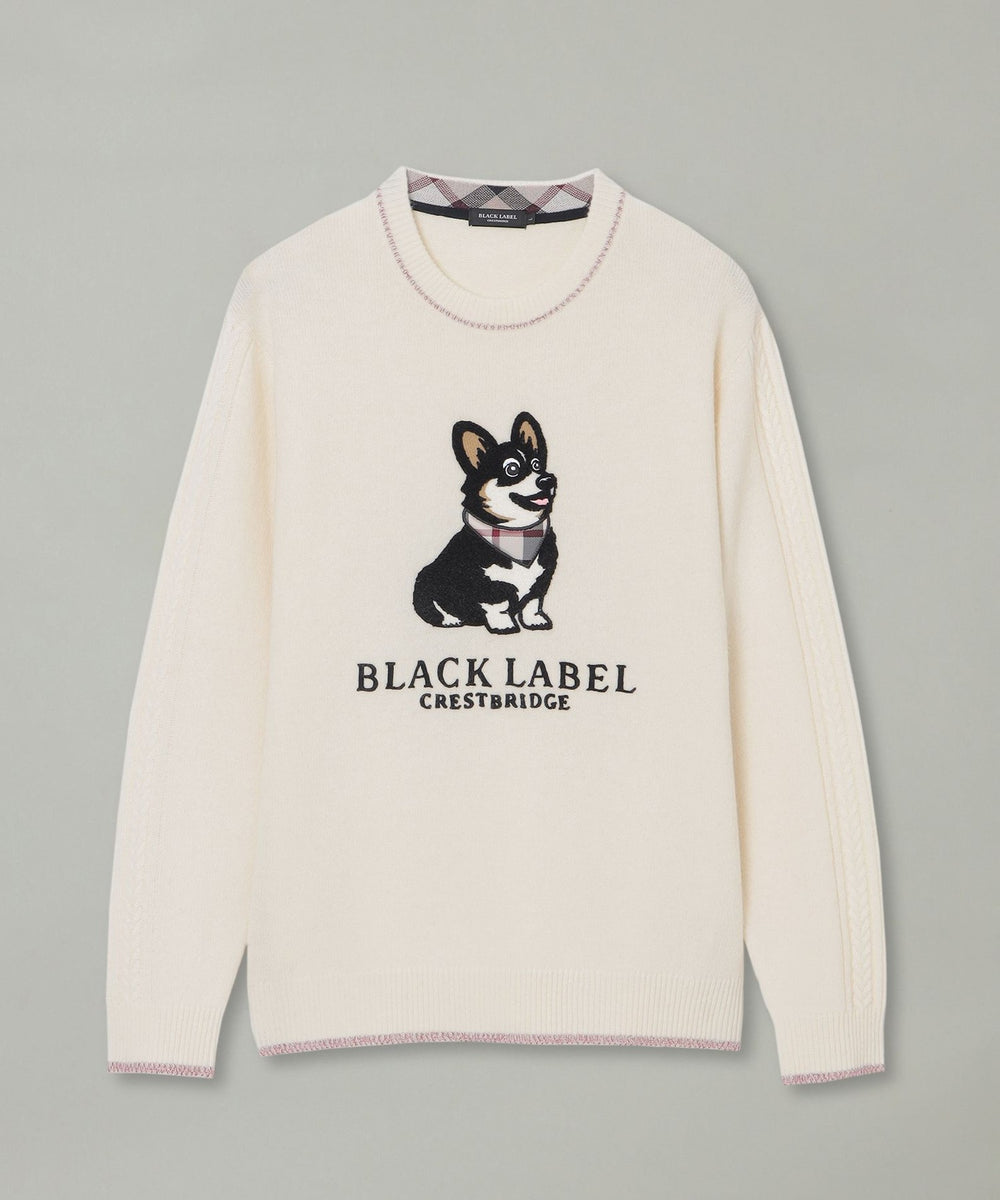 暖かみのある素材で仕上げたクルーネックニット。胸元にはイギリス原産で英国王室にも愛されたコーギー犬を、パイルのようなループが特徴の相良(サガラ)刺繍で表現。刺繍の一部にクレストブリッジチェックのアップリケを施し、ブランドアイデンティティを際立たせています。袖にはケーブル編み柄をあしらい、温かみのある表情をプラス。さらに、衿・袖口・裾には赤いラメ糸のラインを加え、控えめながらも華やかなアクセントを添えました。衿内側にもチェック柄のジャカードをあしらう等、細部にもこだわった上質な一着です。