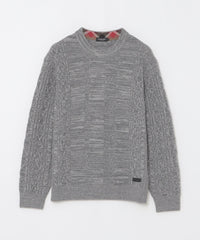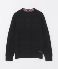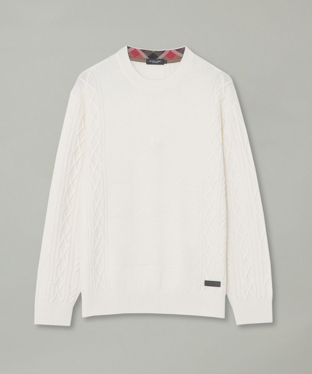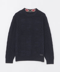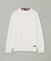 上質な羊毛にカシミヤをブレンドした、柔らかく暖かみのある中肉ニット。肌寒くなるシーズンに向けて、軽さと暖かさを兼ね備えた心地よい着心地が魅力の一枚です。デザインは、ケーブル編みやポップコーン編みなど、伝統的な編み柄を組み合わせることで立体感を演出。身頃中央にはシャドーのクレストブリッジチェックをさりげなく表現し、ブランドらしい上品さを添えています。また、後ろ衿の内側にはハイゲージのダブルジャカードでクレストブリッジチェックをあしらい、見えない部分にもこだわりを感じさせるデザインです。