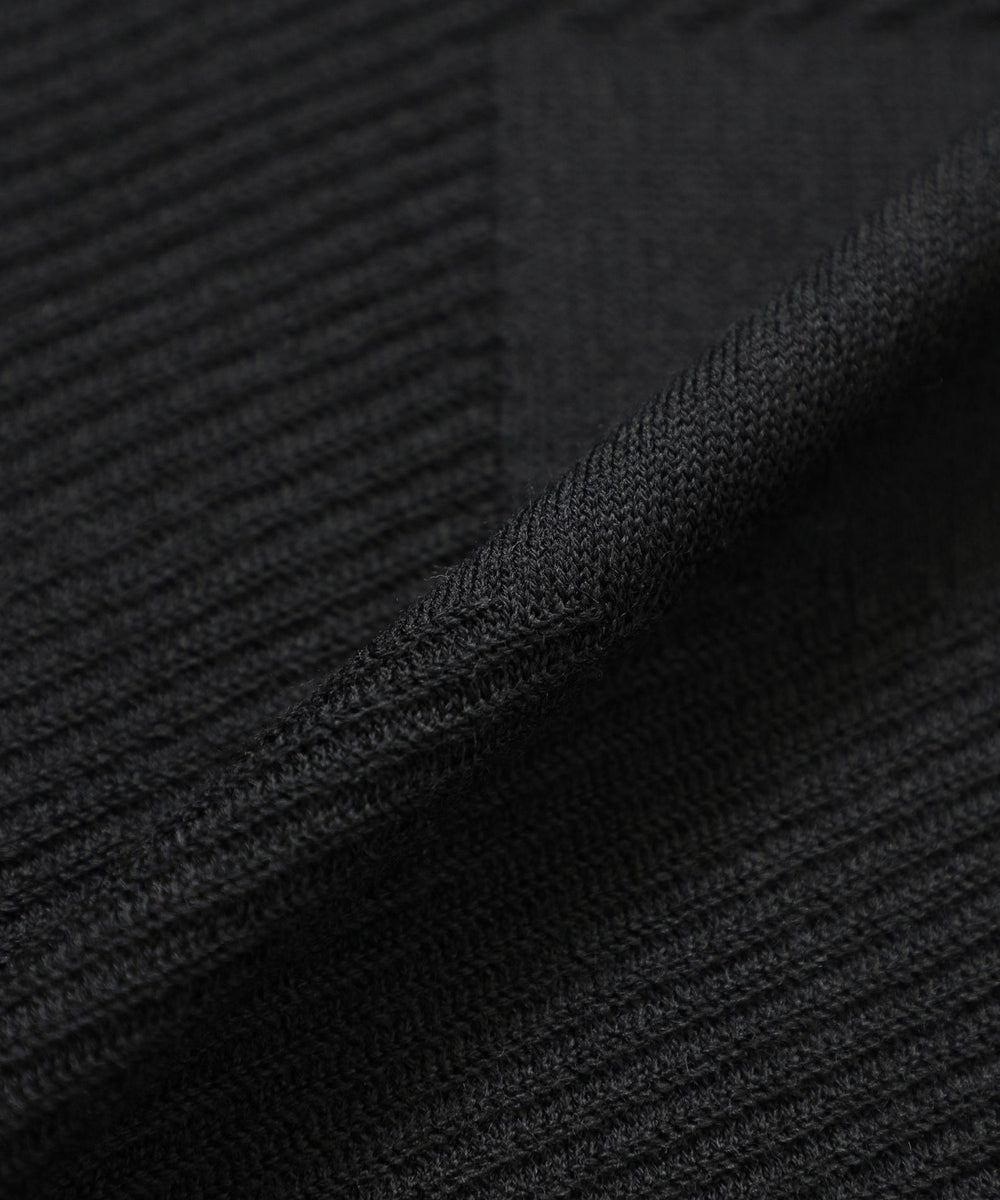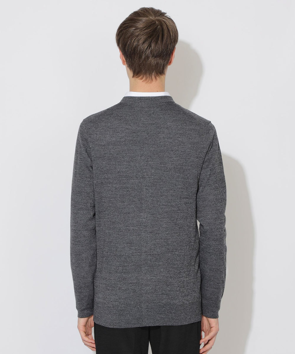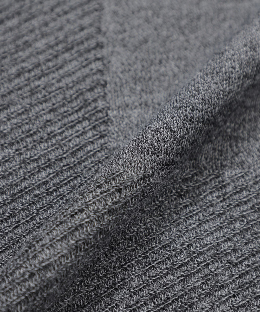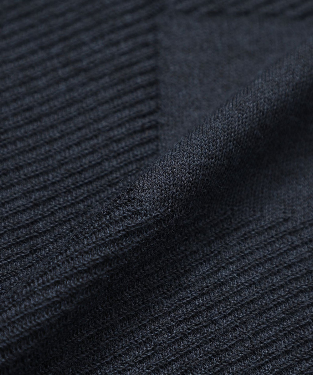 素材には羊毛×アクリルの糸を使用。細い繊維で作り上げた糸を使用しているため、チクチクしづらく、しなやかな肌触りの編地に仕上がっています。糸に特殊な加工を施す事で、手洗い可能なニットに。洗濯後は若干寸法が伸び縮みする為、当て布をした上で低温アイロン(スチーム無し)で形を整えて頂くときれいに仕上がります。