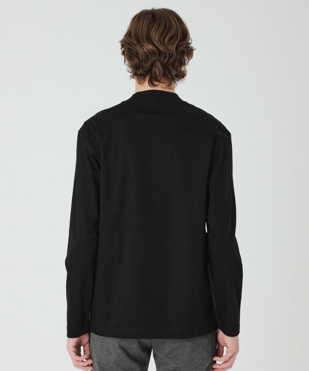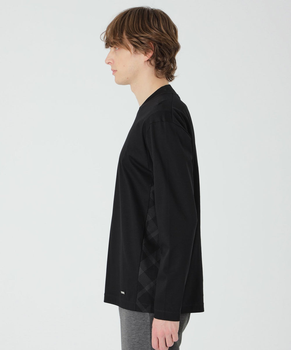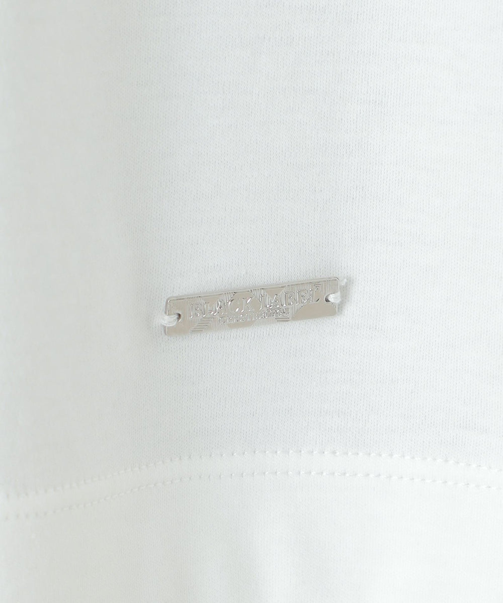 ジャケットのインナー合わせに開発されたキレイ目カットソー。衿の後ろ側をやや高く設定することでジャケットの衿登りとのバランスを美しく保ちつつ、皮脂による衿裏汚れも防ぐ仕様に。背幅を胸幅よりも広く設定することで、人体の形に沿った立体的なパターンを作り出しています。さらに脇部分を切り替える事で、より立体的な設計に。脇部分にシャドーのクレストブリッジチェック柄をあしらうことでブラックレーベルらしさを演出しています。肩傾斜やシルエットはインナーとしてもたつかないようにスッキリと仕上げています。左裾のロゴ入りのシャドーのチェック柄メタルプレートが高級感を演出します。