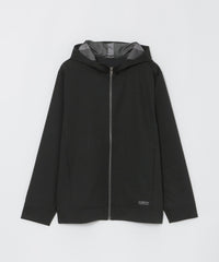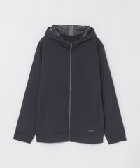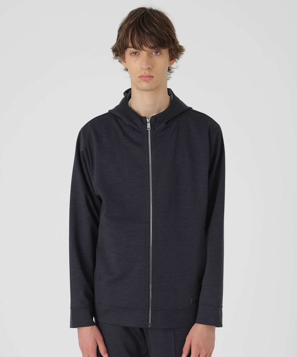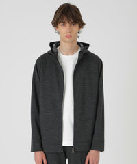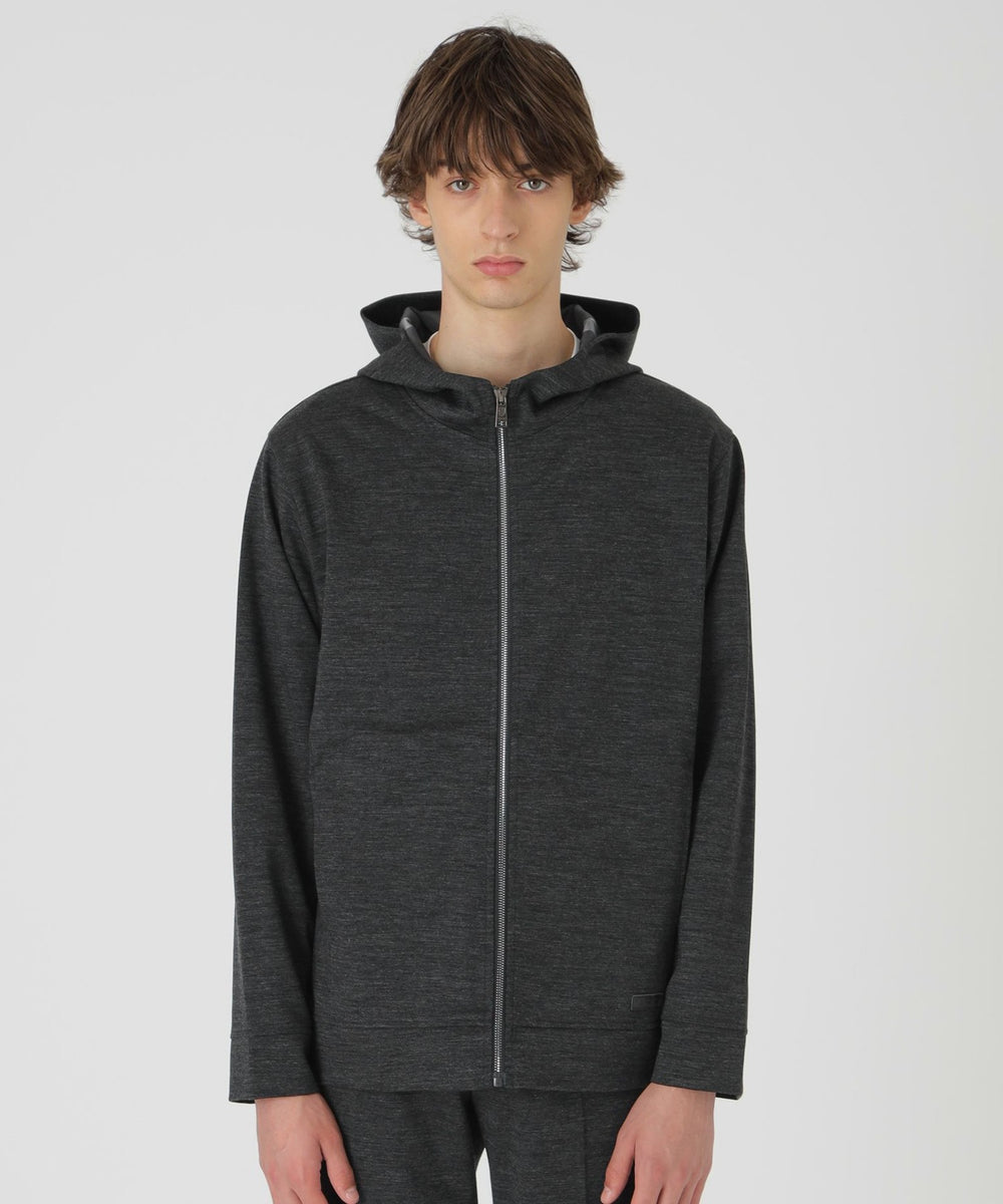 上品な光沢をもつウールジャージー素材を使用したジップアップパーカー。ブルゾンのような見映えでありながら、ジャージーならではのストレッチ性と軽さで、気軽に羽織ることができる一着です。メランジ調のカラーリングと程良いハリ感によりオトナなテイストのパーカーに仕上げています。フード裏にあしらったチェックや光沢感あるファスナーなど細かな部分にもこだわった一着です。