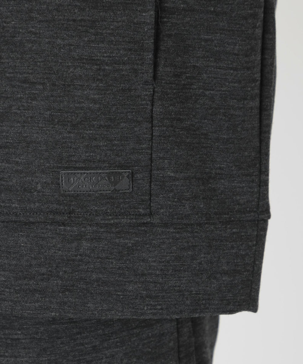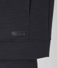 表地には、表側が細番手のウールを用いて丁寧に編み上げたなめらかで上質なタッチの薄地ジャージー素材、裏側にはハイゲージのポリエステルストレッチジャージーを貼り合わせたボンディングジャージー素材を使用しています。