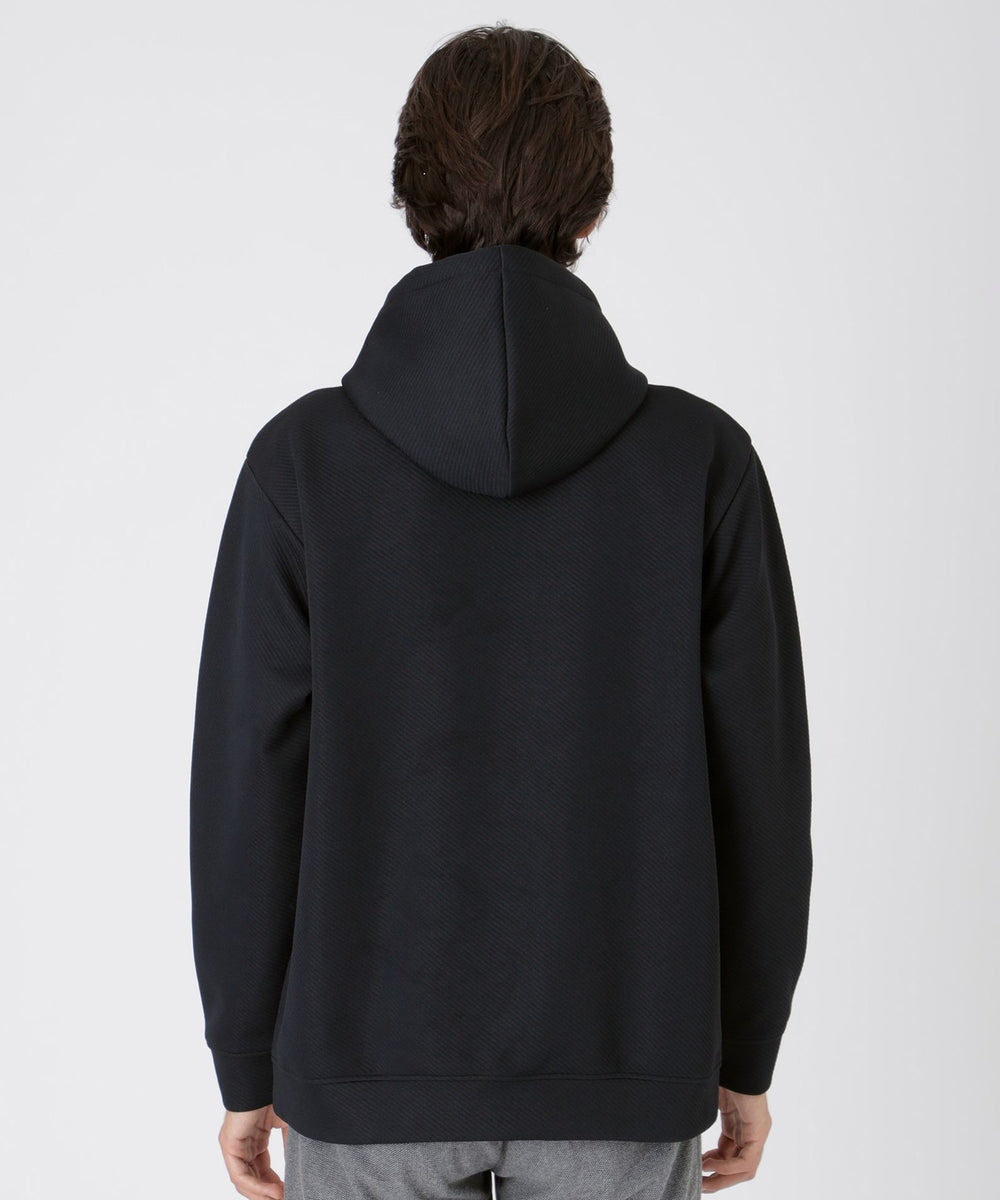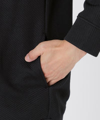素材はジャカードによる凹凸でカルゼ組織を表現した生地を使用。ブリスタージャカードという中にワタを入れながら編む特殊な編み方を採用する事で、より立体感ある柄に仕上げています。軽やかで程良いストレッチ性もあり快適な着心地もポイントです。