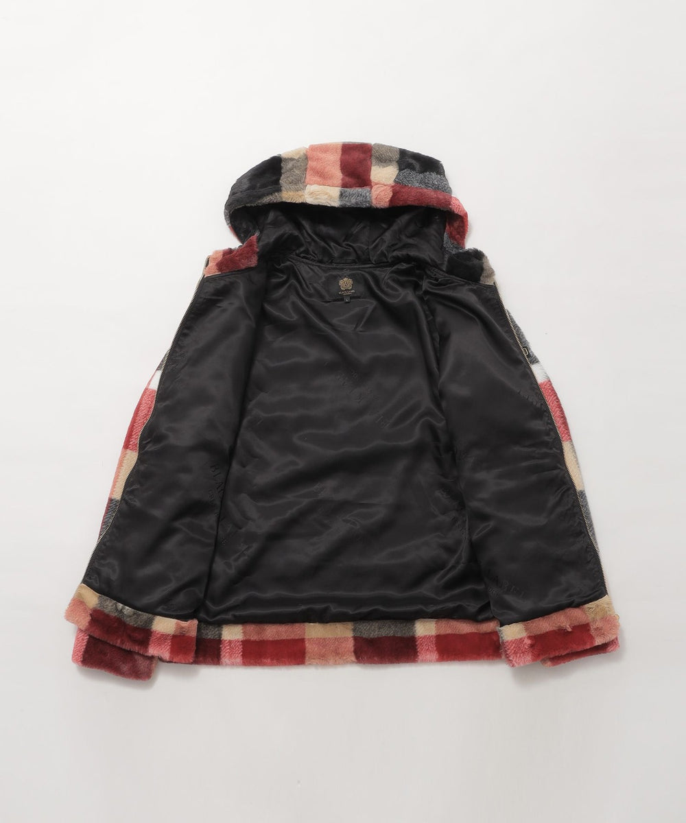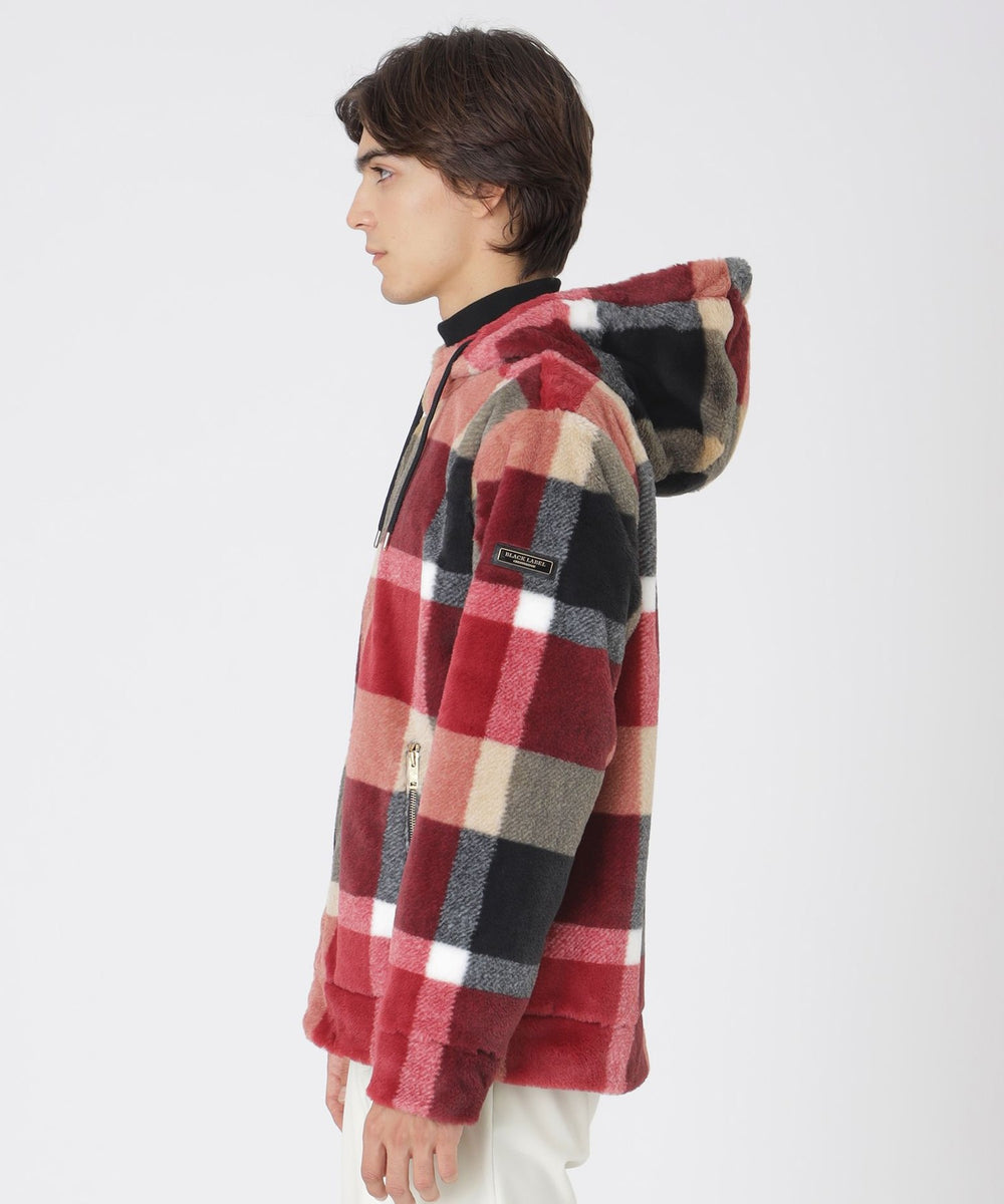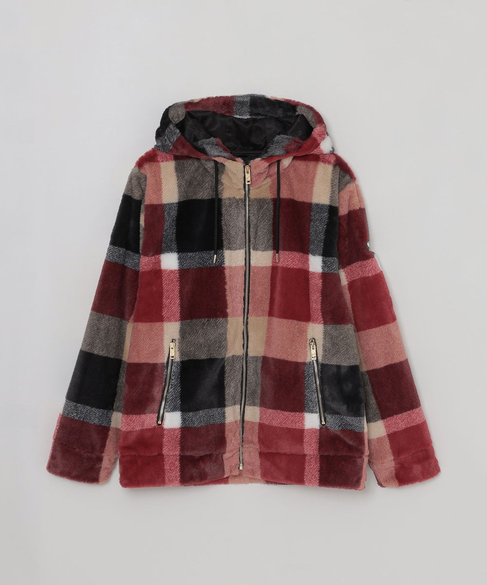素材にはラビットファーのような毛足の長さと繊細なタッチが魅力のエコファーを使用。上品なツヤ感とボリュームのあるシルエットが特徴で、着るだけで高級感を演出できます。毛足の長いファーにもかかわらず、クリアで繊細なチェック柄をスクリーンプリントで表現。織りのように見えるほど繊細なプリントは非常に高度な技術によるもので、他では表現できないプレミアムファブリックに仕上げています。