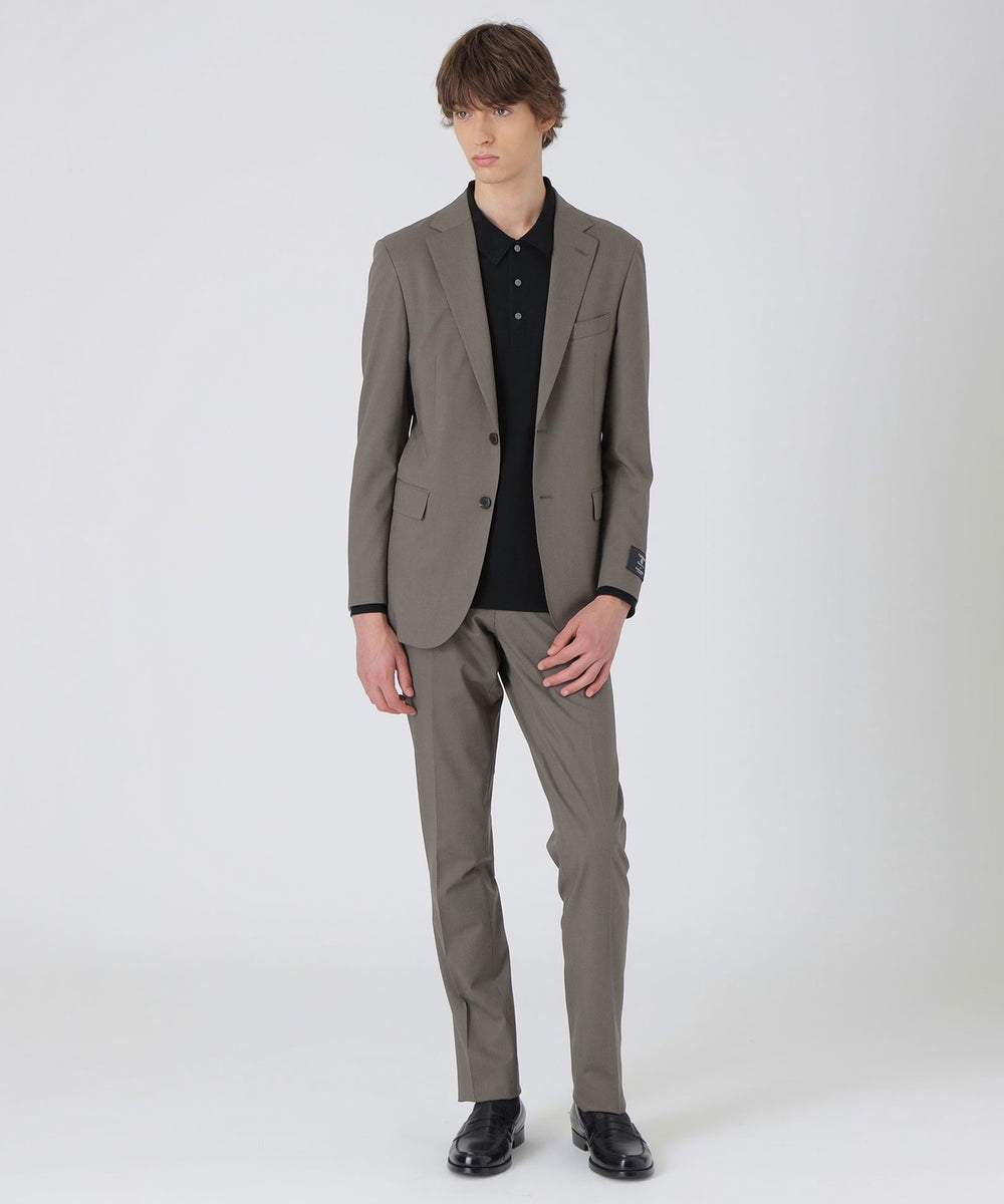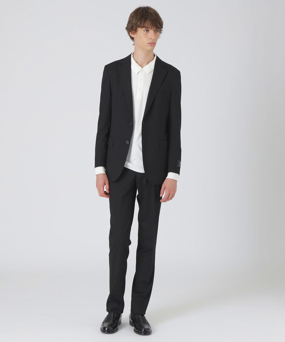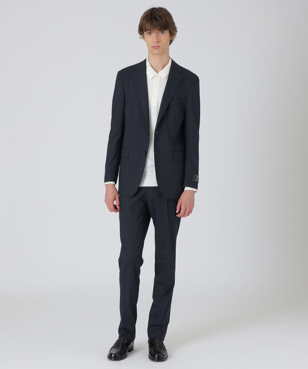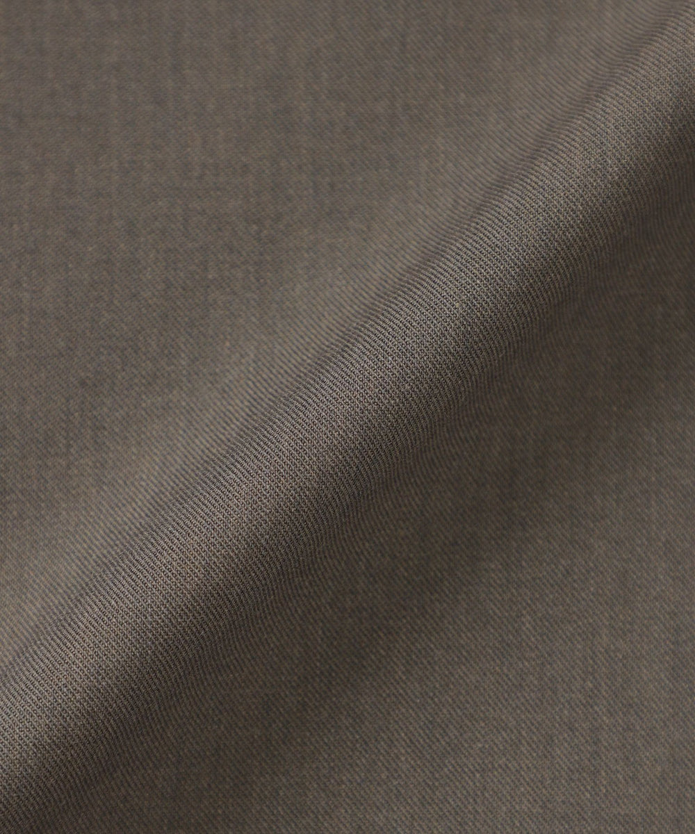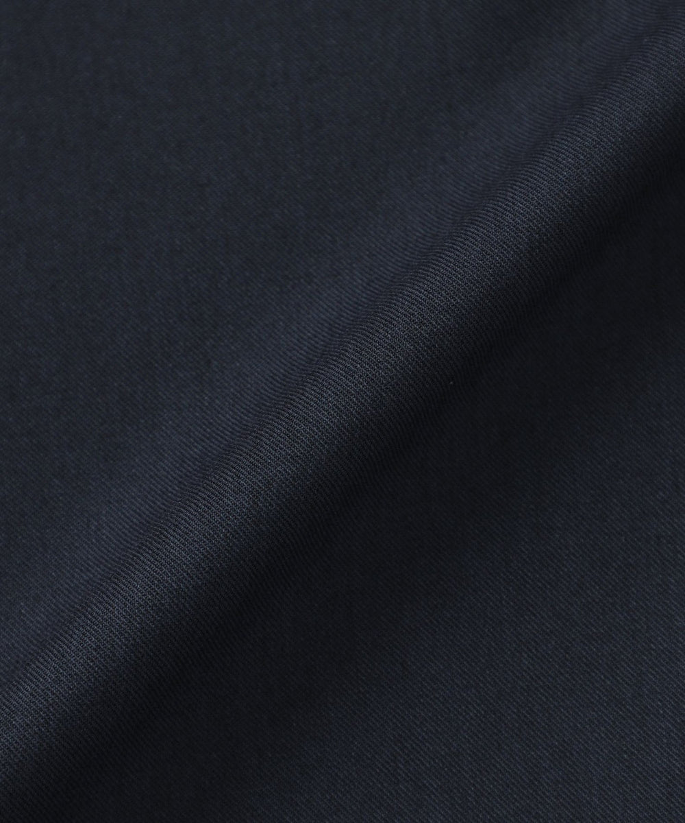 素材には、フランスの高級生地メーカーCARREMAN社の生地を使用。ポリエステル・レーヨンに羊毛を混紡した複合素材。通常のポリエステル・レーヨン素材に比べ、糸の繊維長が長く、合繊繊維でありながらウールのようなナチュラルな風合いと仕立て映えの良さが特徴です。更にウォッシャブル性・防シワ性・適度なストレッチ性を保持した機能性も併せ持った素材です。