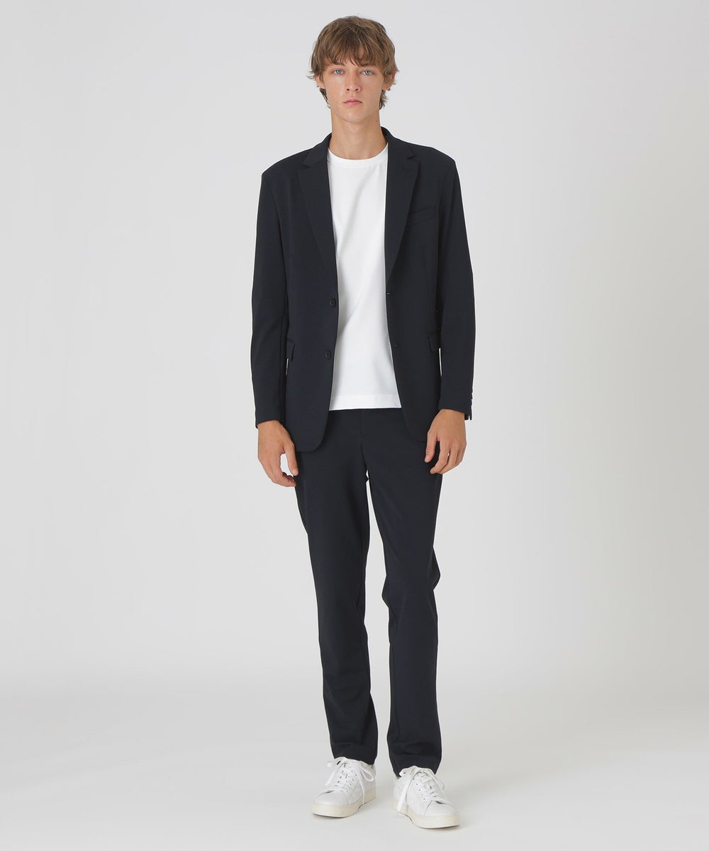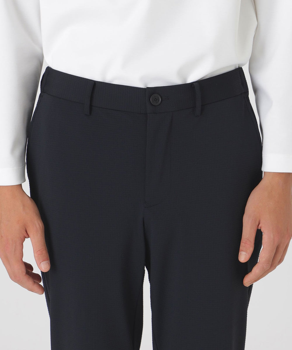 表地にはストレッチ性の高い軽量2wayストレッチナイロントリコット素材を使用。圧倒的な伸縮性に加え、裏面に格子状の凹凸のある組織を配することで肌離れの良さを付帯しています。UVカット機能も持ち合わせており暑い時期でもストレスなく着用が可能。シワになりづらく、イージーケア性の高い素材です。