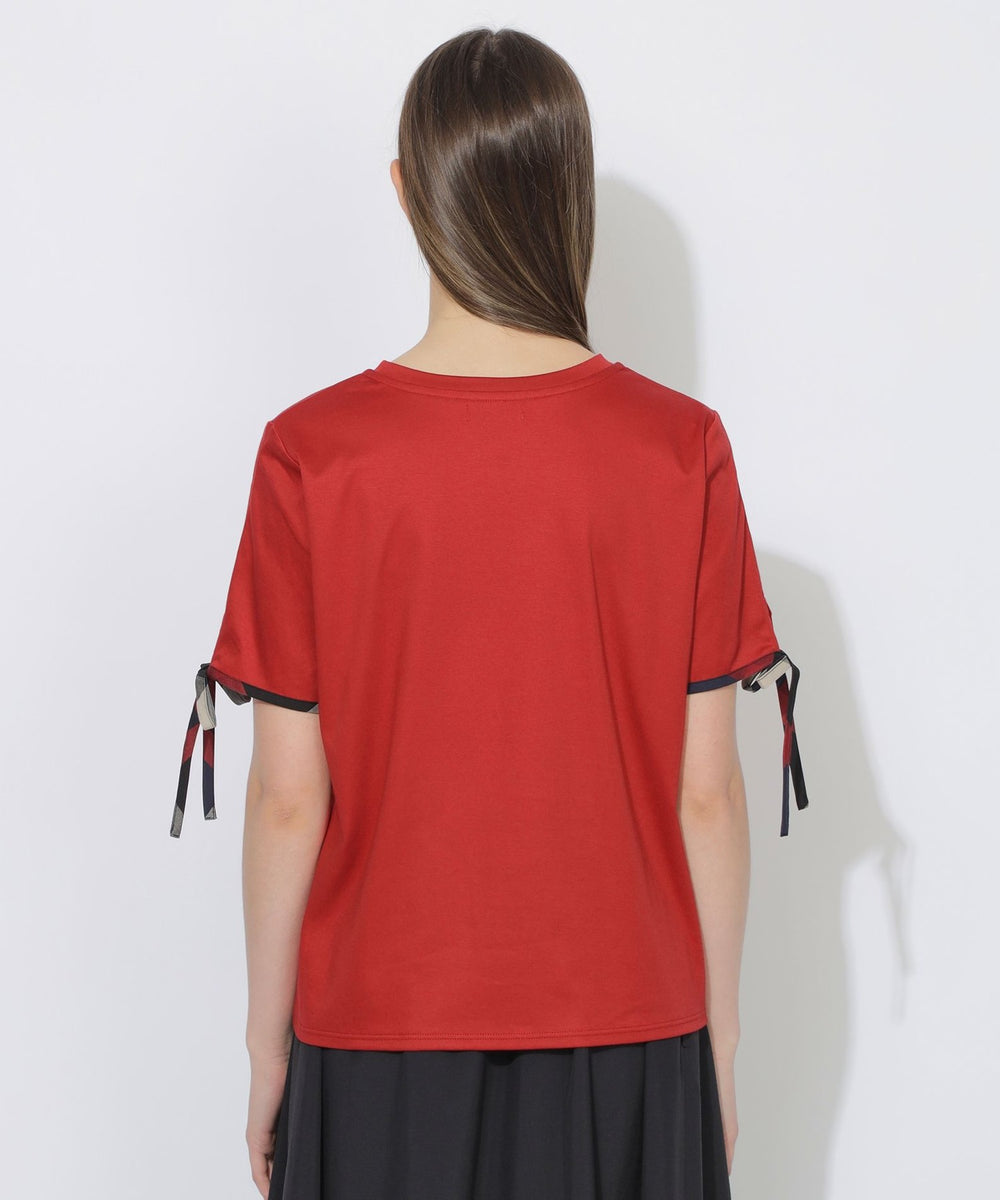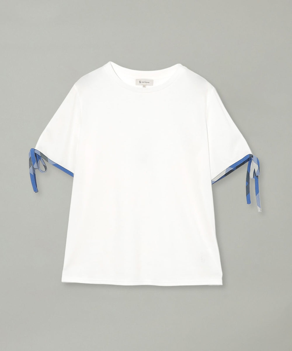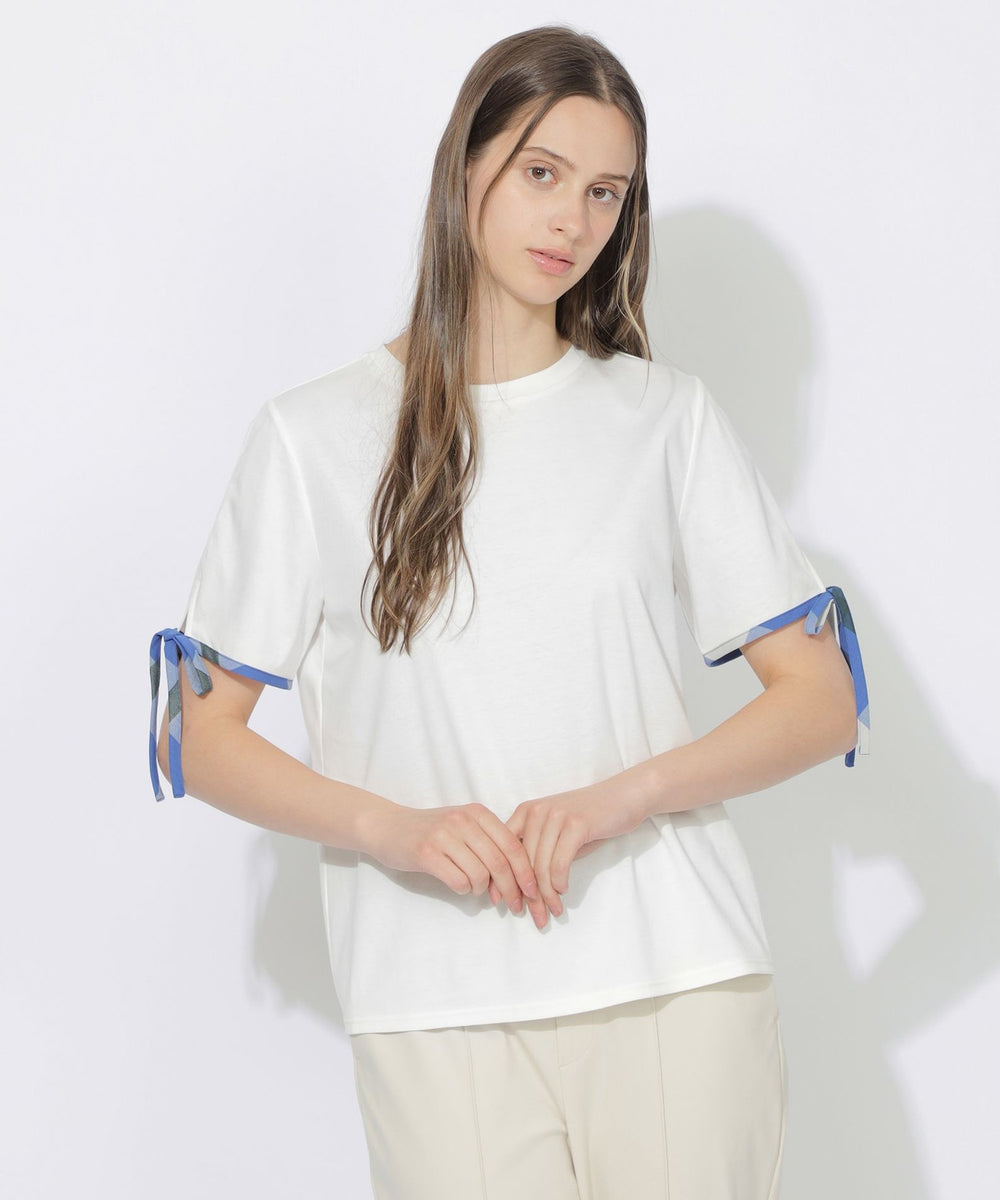 袖口にあしらった華奢なチェック柄リボンがポイントのTシャツ。