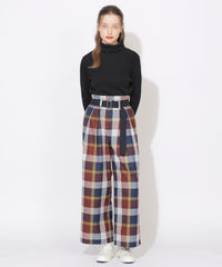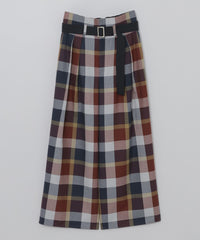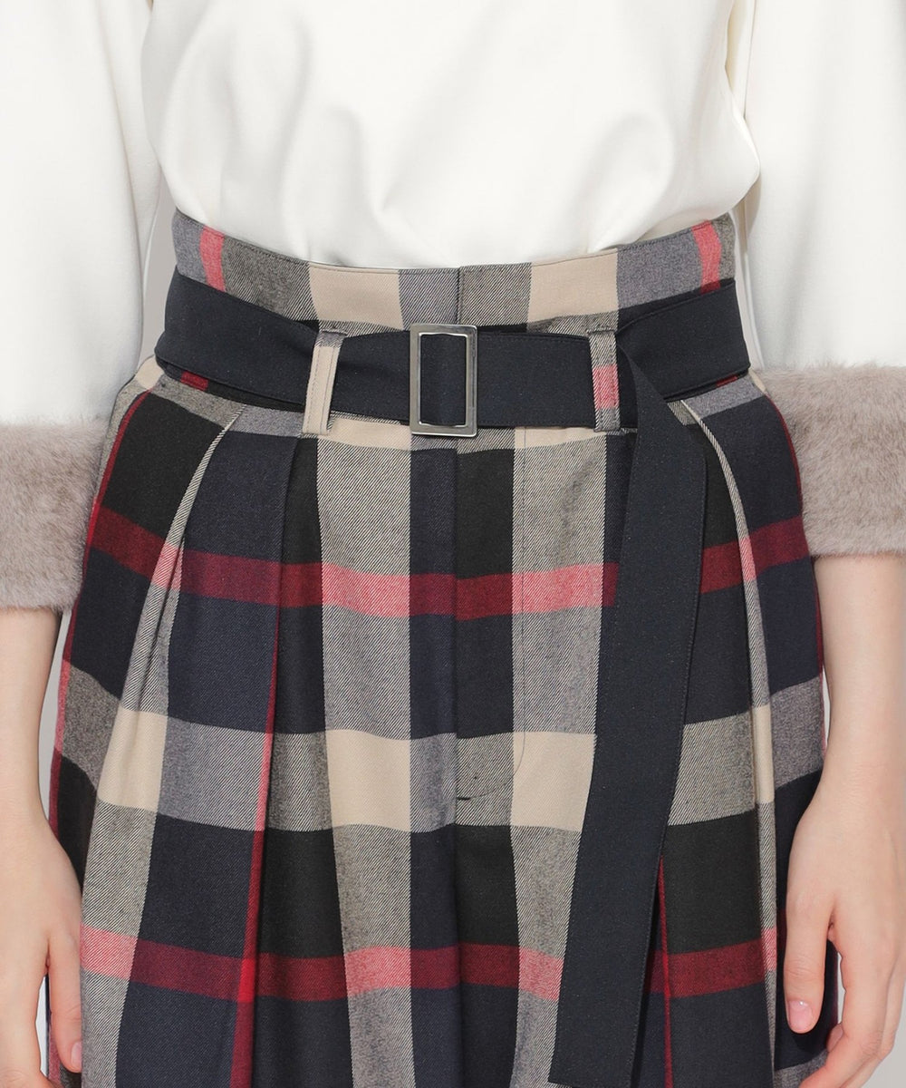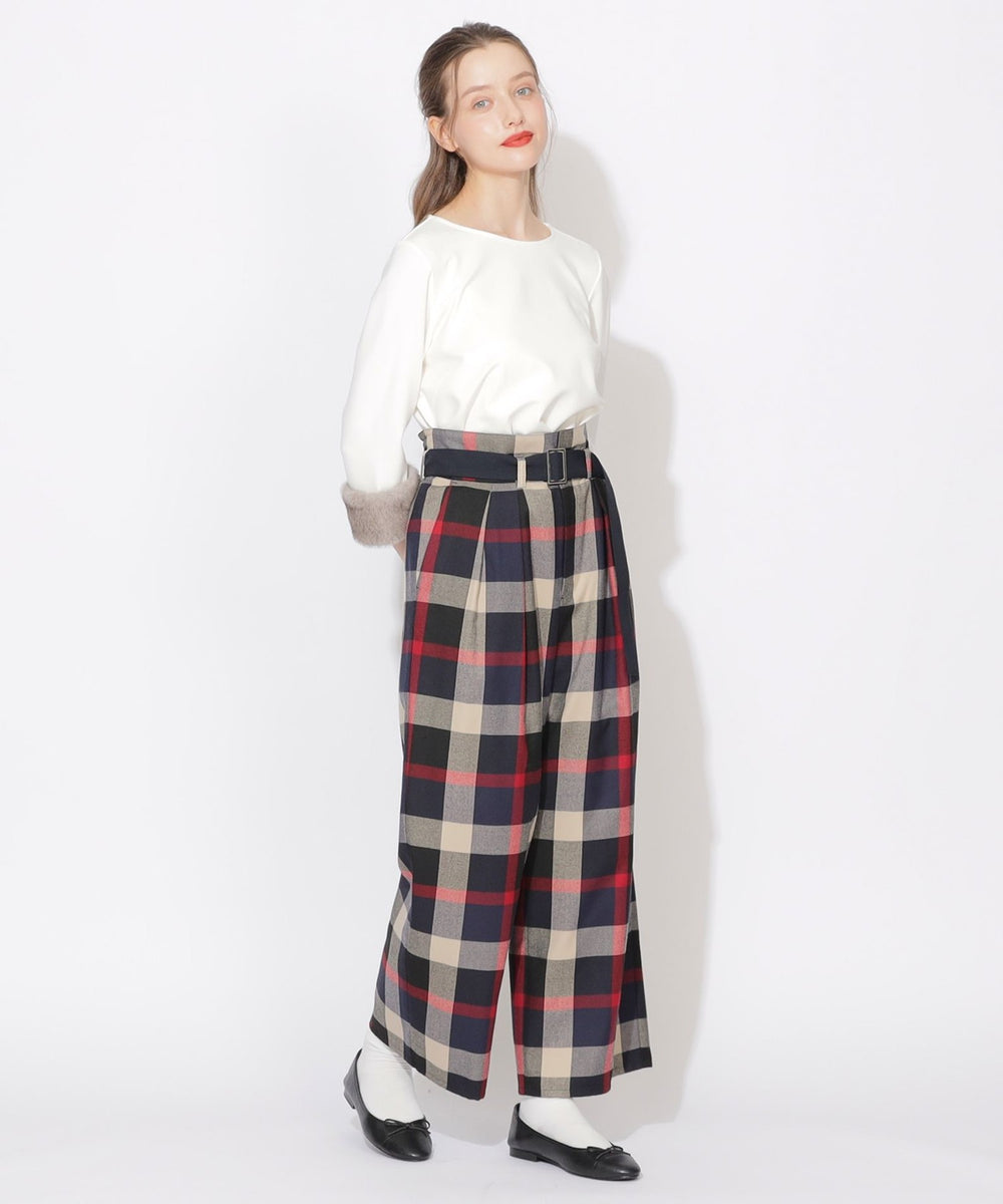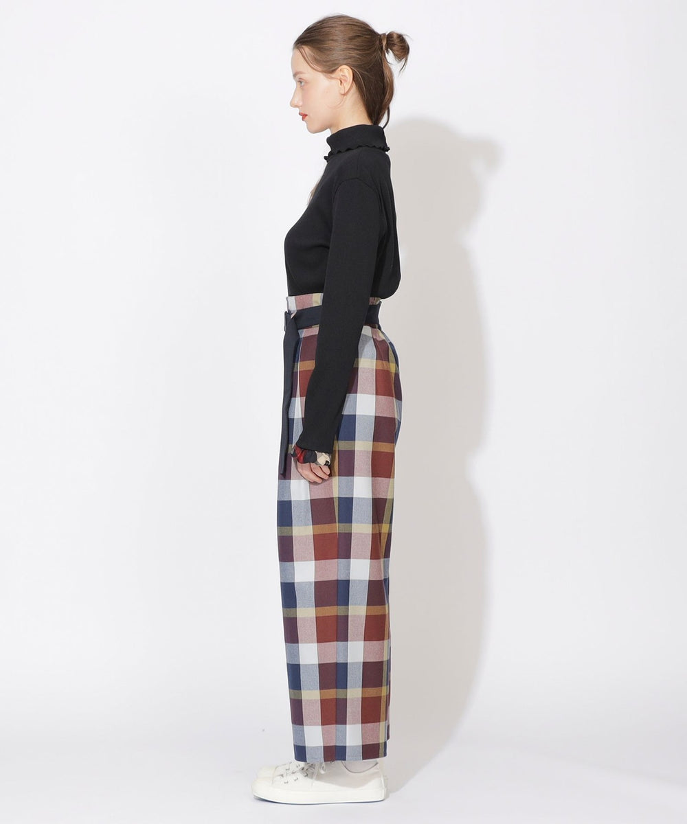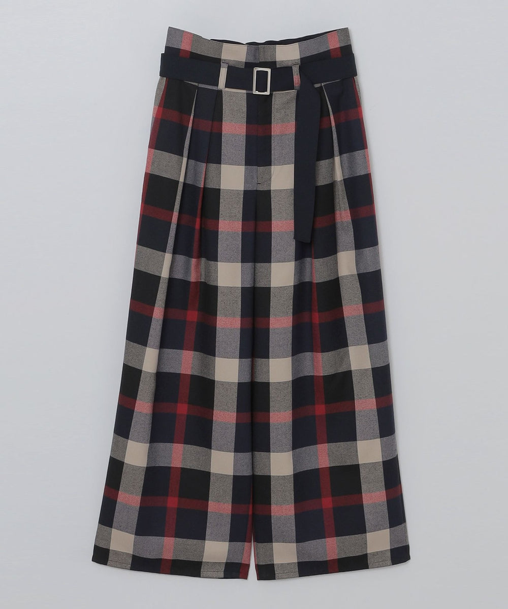 チェック柄のボトムに、バックル付きベルトを組み合わせたデザインが、コーディネートにほどよいアクセントと引き締め感をプラスします。