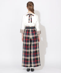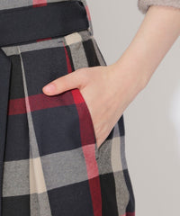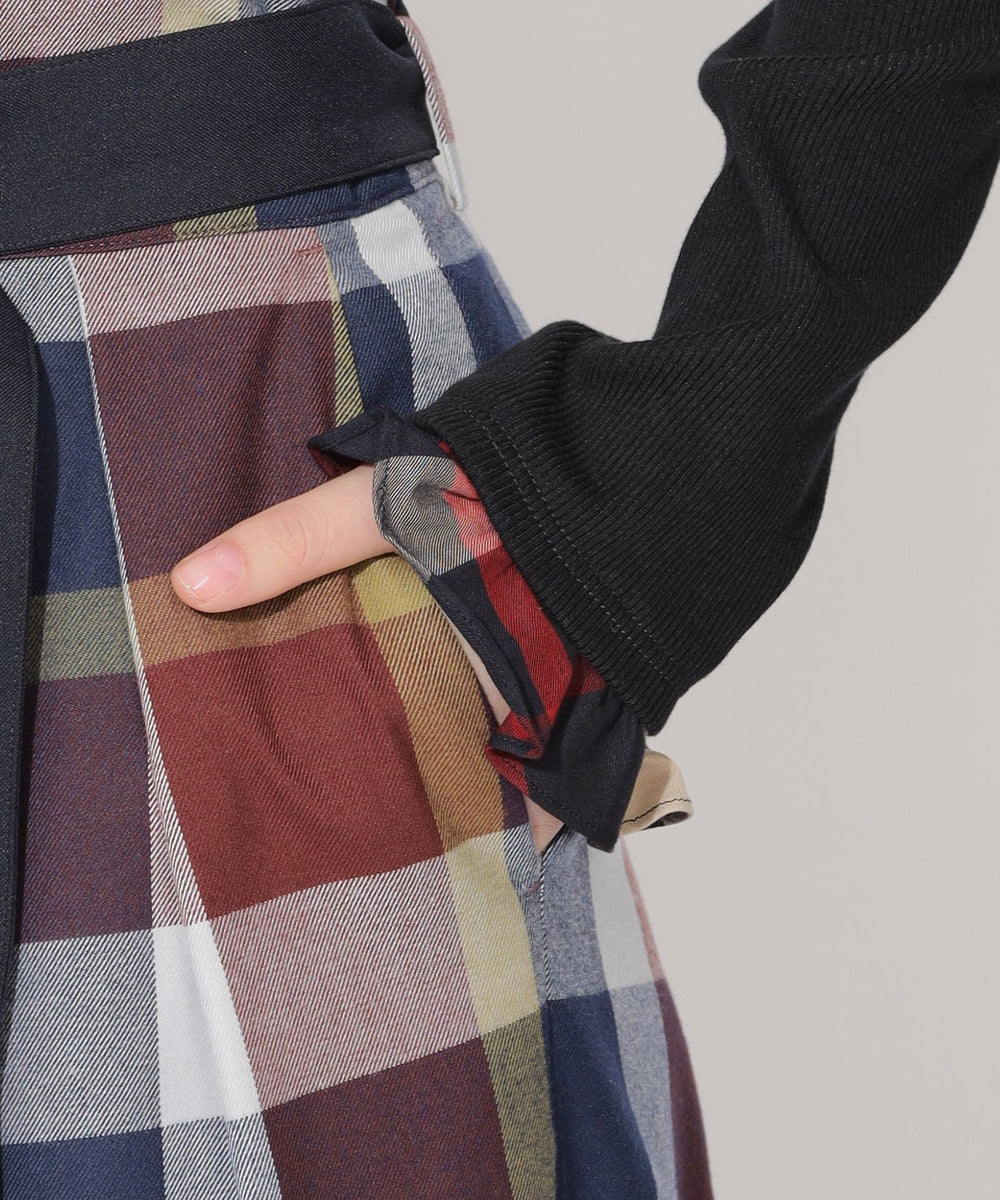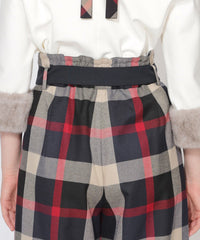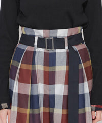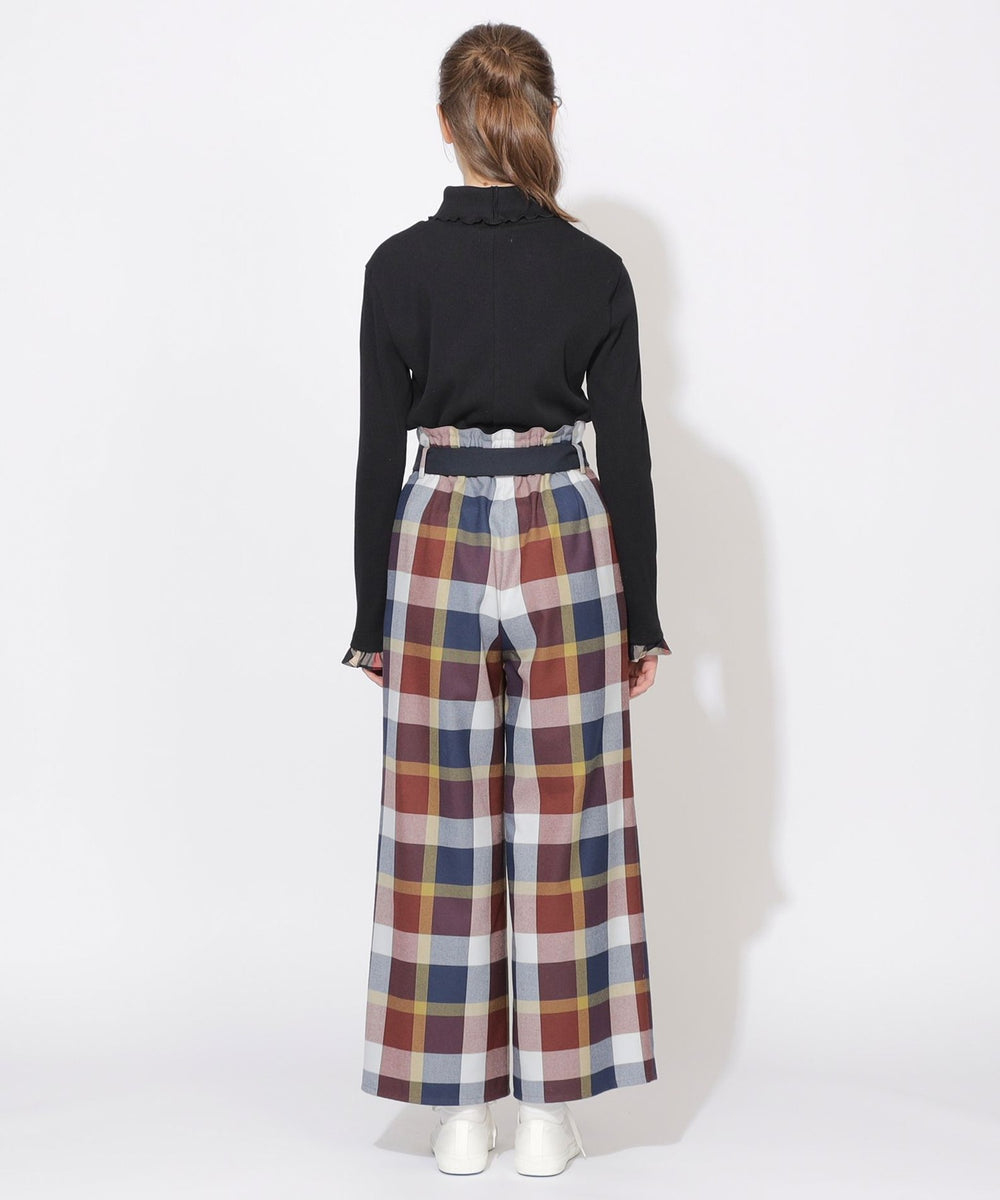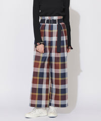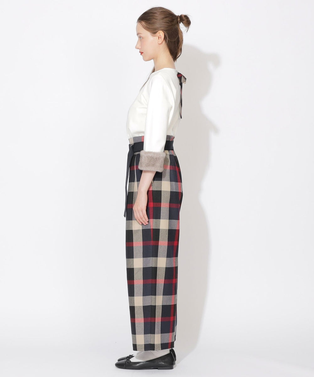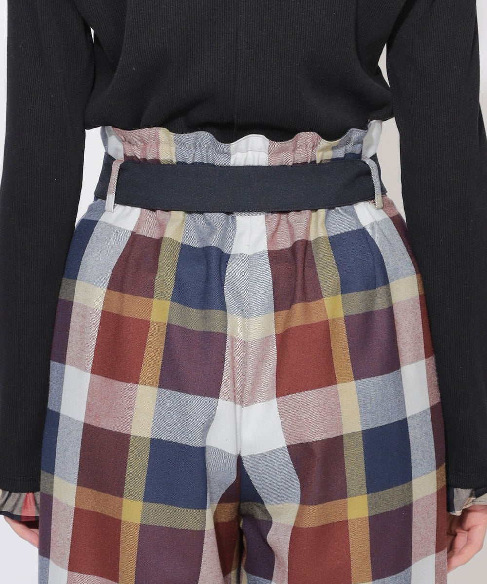 チェック柄のボトムに、バックル付きベルトを組み合わせたデザインが、コーディネートにほどよいアクセントと引き締め感をプラスします。